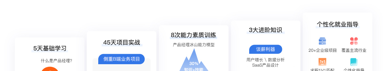 新增產(chǎn)品基礎(chǔ)、電商項(xiàng)目、移動(dòng)端項(xiàng)目實(shí)戰(zhàn)、項(xiàng)目管理、互聯(lián)網(wǎng)金融